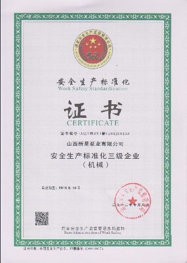 山西新星泵業(yè)有限公司獲國家安全生產(chǎn)監(jiān)督管理總局為我公司發(fā)放安全生產(chǎn)標(biāo)準(zhǔn)化證書。
